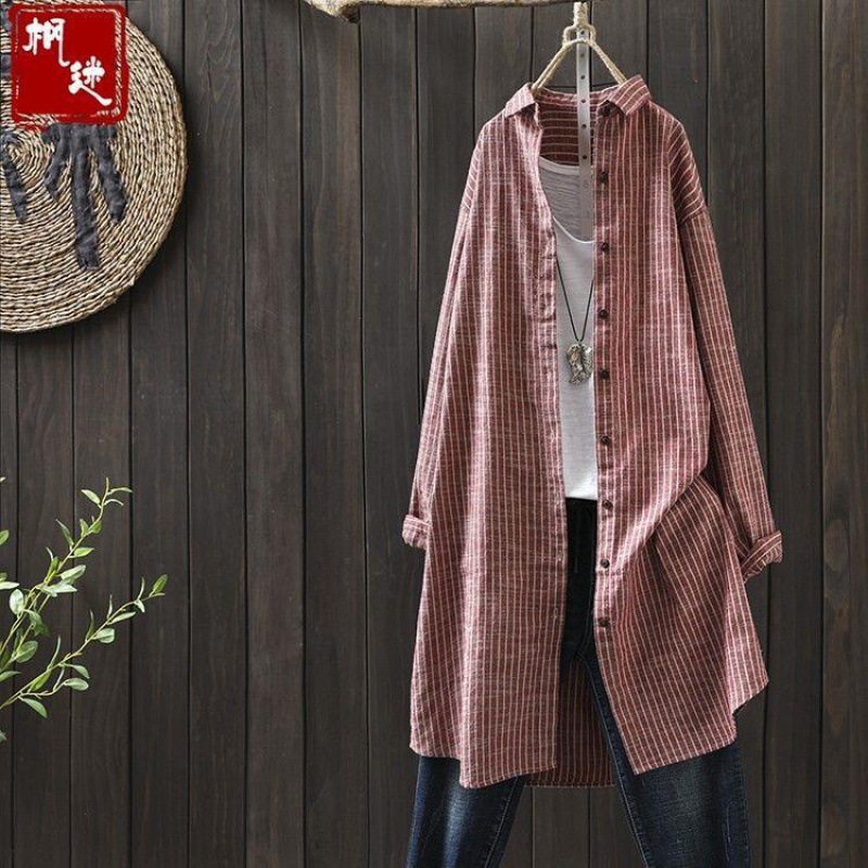 Women’s Literary Cotton And Linen Striped Shirt Midi Long Sleeve Plus Size All-match Tops And Skirts