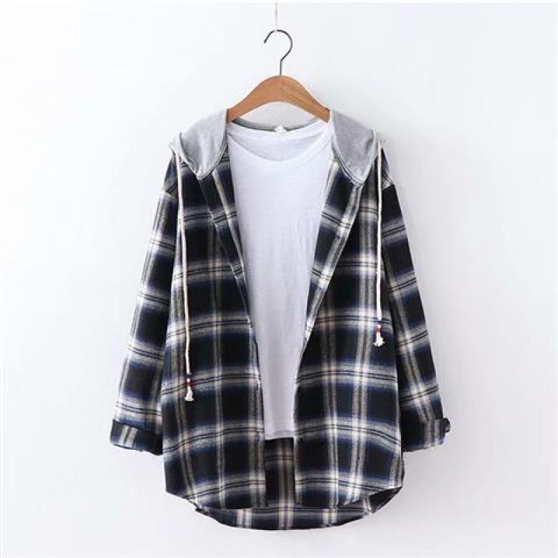 Plaid Shirt Women’s Retro Hong Kong Style Ins Loose Hooded Cardigan Jacket Shirt