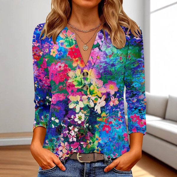 Women’s 3D Printed Fashion Casual V-neck Long-sleeved T-shirt Top