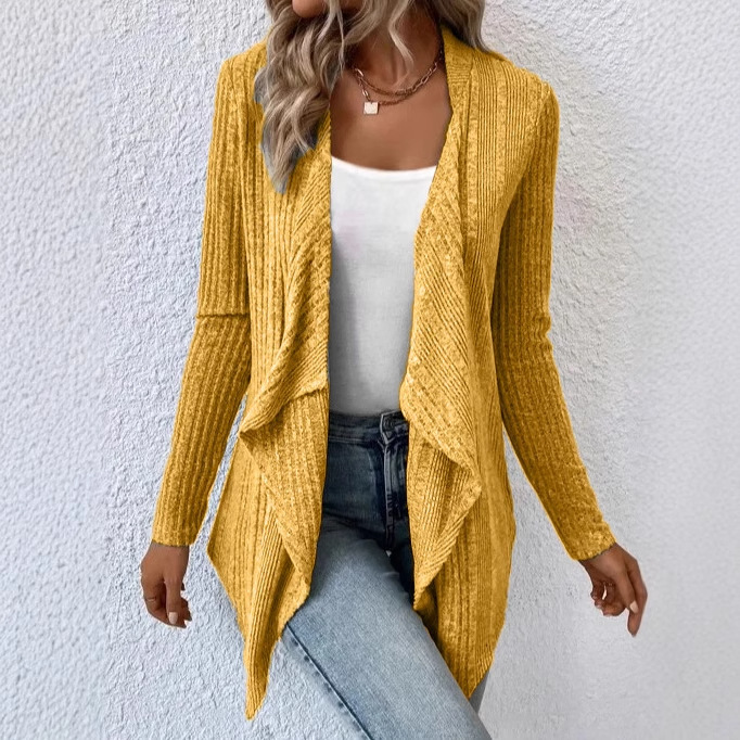 Solid Color Fashionable Ribbed Knitted Cardigan Long Sleeve Sweater