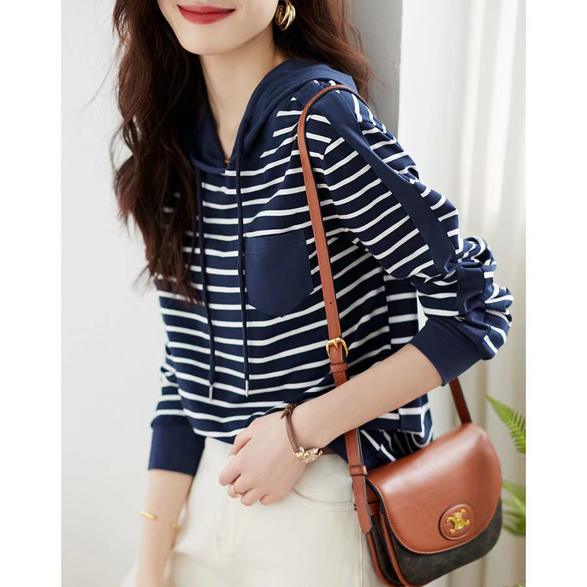 Simple Commute Hit Pocket Contrast Color Hooded Long Sleeve T-shirt